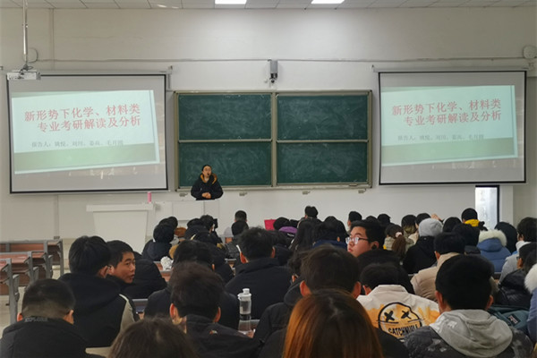 在了解到2017级学生在报考院校选择、专业方向选择等方面存在诸多不足,特别是2018级准备考研的学生在研究生备考起步阶段存在诸多困惑的情况后,学院材料工程系教工党支部和应用化学系教工党支部党员自发组建了考研指导团队,以考研专题讲座形式为学生答疑解惑。姚悦老师以“新形势下化学、材料类专业考研解读及分析”为题,全方位为学生讲解了考研专业选择方法及各专业未来发展趋势和就业方向;叶龙强老师结合自身经历,以各考试科目的特点为切入点,分科讲解复习过程中的科学安排,并指导学生合理安排生活作息,做到张弛有度、劳逸结合。毛月圆、刘川、姜兵、汤凯、张少卿等多位老师则结合自身专业,耐心细致地解答了同学们提出的相关问题。